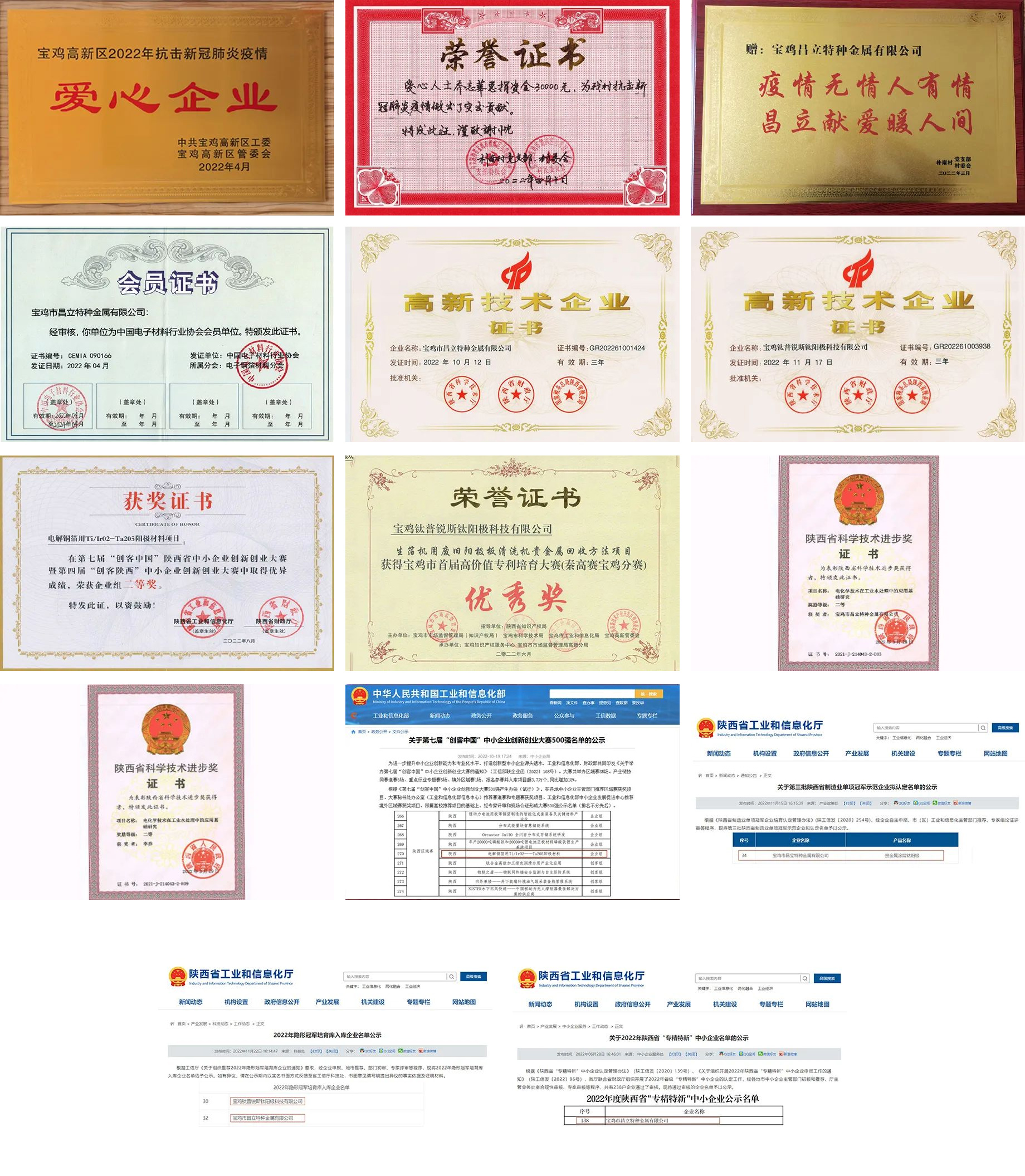 歲月不居,天道酬勤。回顧2022年,公司創造了可喜可賀的成績。在疫情期間承擔社會責任,助力一線抗疫。昌立公司被認定為陜西省“專精特新”中小企業;《電化學技術在工業水處理中的應用基礎研究》項目獲“省科學技術進步獎”二等獎;入選第三批陜西省制造業單項冠軍示范企業;入選2022年陜西隱形冠軍培育庫。鈦普銳斯被認定為“國家高新技術企業”;2022年陜西省秦創原高價值專利大賽分賽區-“寶雞高價值專利培育大賽優秀獎”;第四屆“創客陜西”中小企業創新創業大賽省級決賽獲大賽企業組二等獎;入圍第七屆“創客中國”中小企業創新創業大賽500強;入選2022年陜西隱形冠軍培育庫。